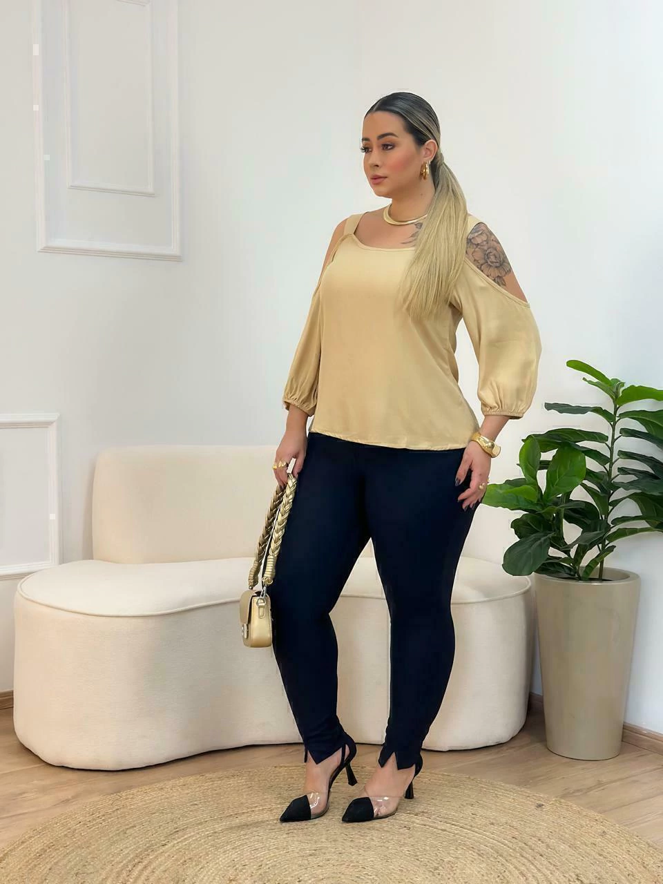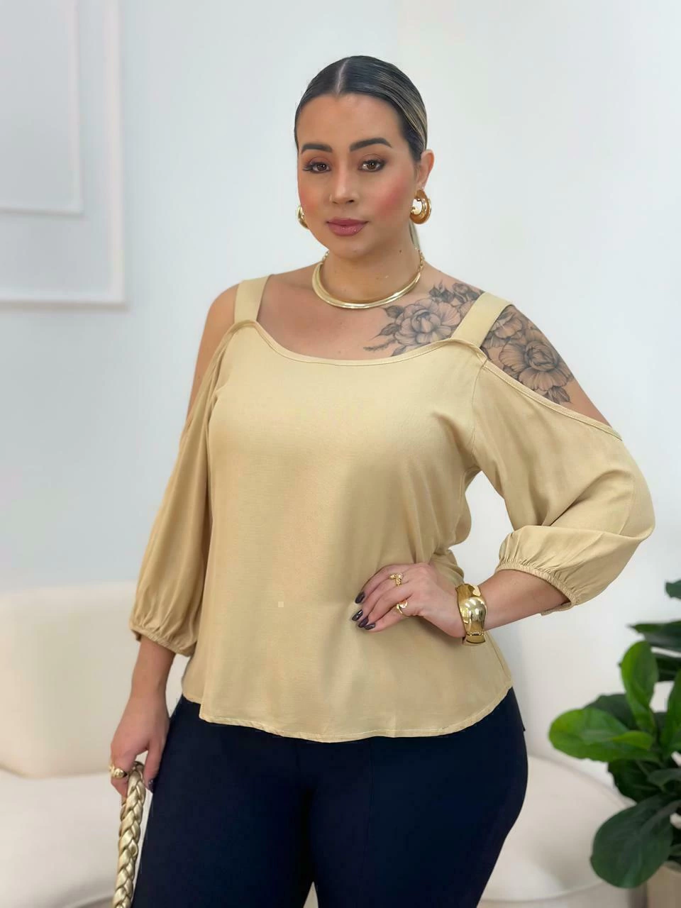 Modelagem: Solta, com ombros vazados Mangas: 3/4 levemente bufantes Tecido: Confortável e fluido Cor: Neutra, ideal para várias combinações
