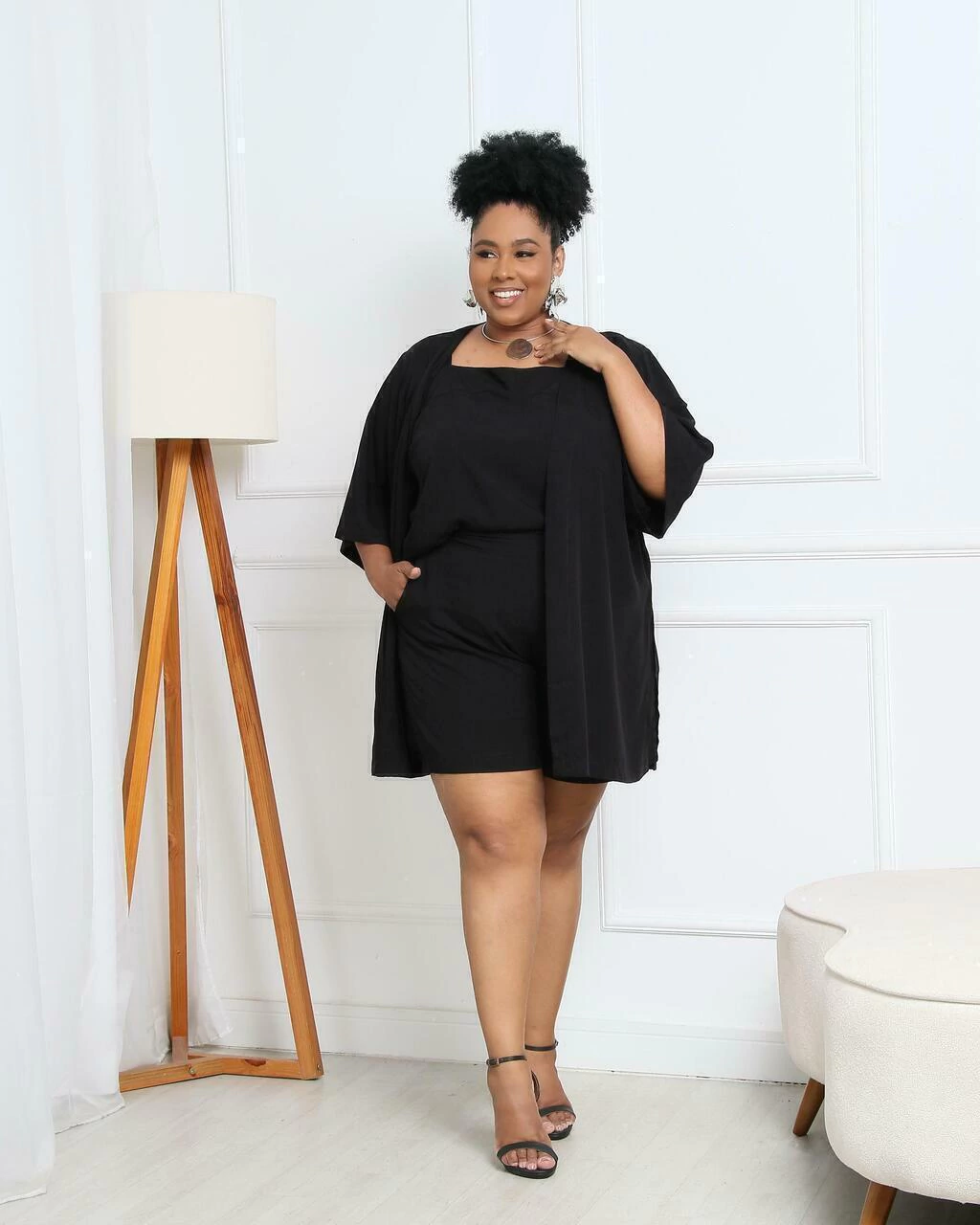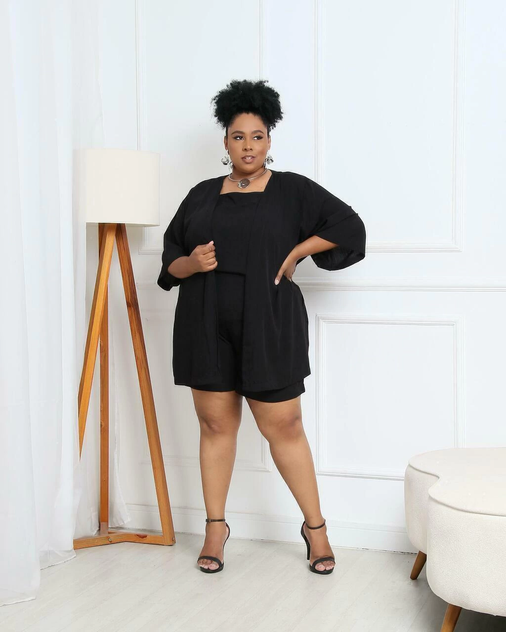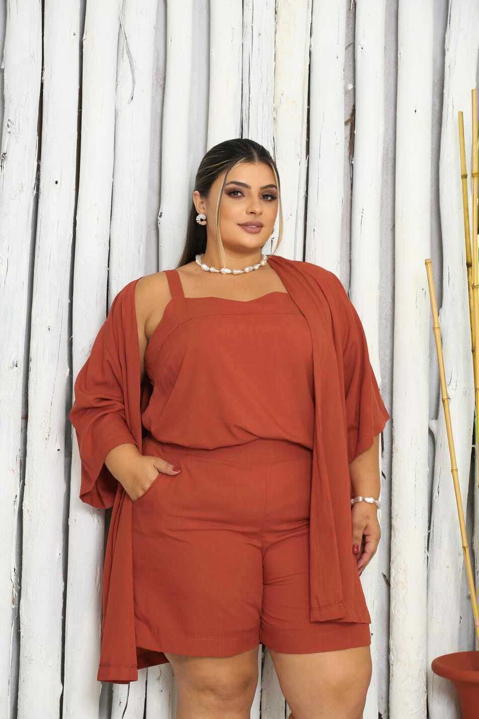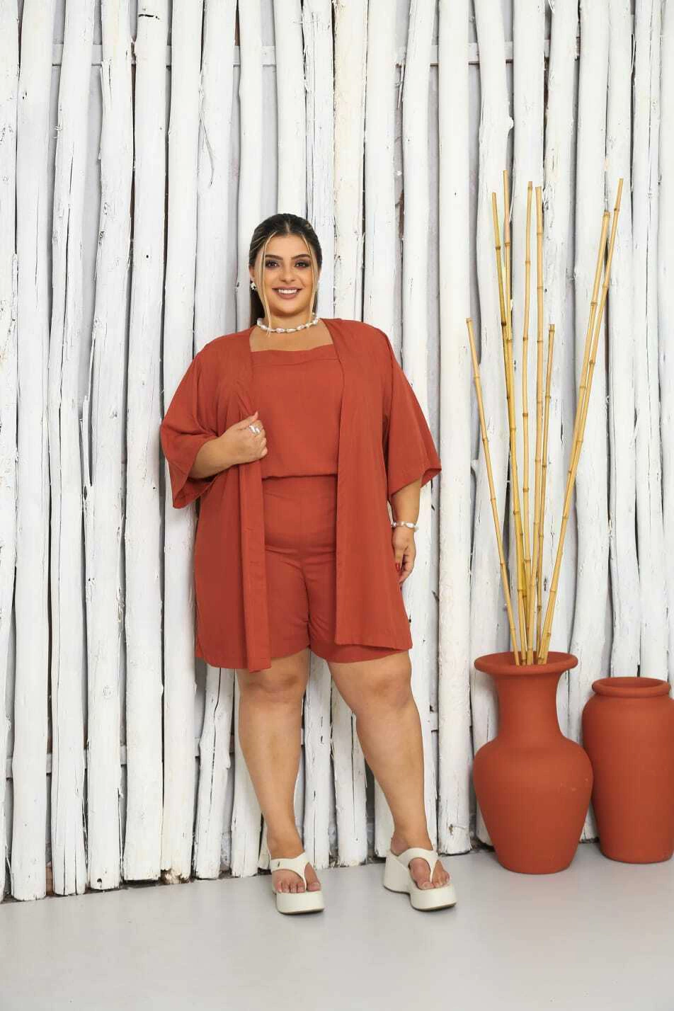 Sabe aquele combo que resolve o look inteiro? O Trijunto Beatriz é exatamente isso. Composto por regata, short e kimono, ele entrega estilo sem esforço e conforto de sobra – tudo com um caimento que valoriza o corpo real.
